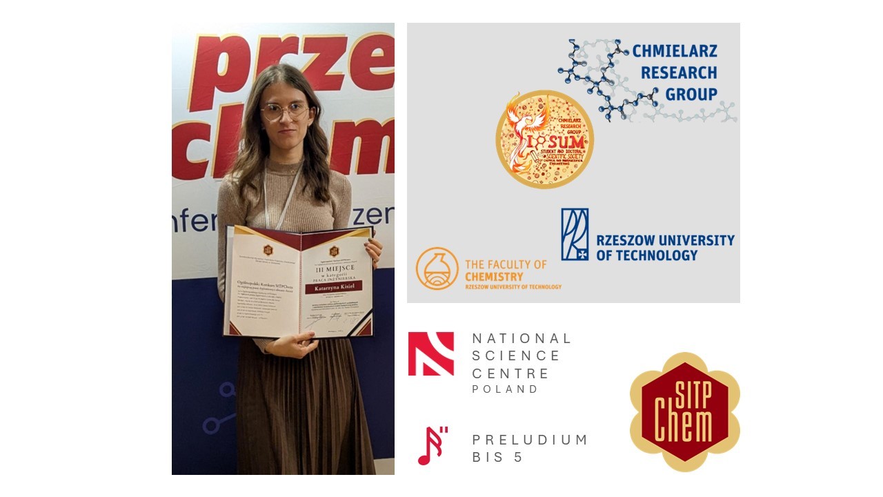 Mgr inż. Katarzyna Kisiel, doktorantka II roku oraz członkini grupy badawczej Chmielarz Research Group, zdobyła III miejsce w ogólnopolskim konkursie na najlepszą pracę dyplomową roku akademickiego 2023/2024, organizowanym przez Stowarzyszenie Inżynierów i Techników Przemysłu Chemicznego (SITPChem) w kategorii prac inżynierskich.