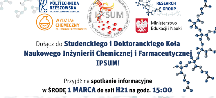 Zarząd oraz Członkowie Studenckiego i Doktoranckiego Koła Naukowego Inżynierii Chemicznej i Farmaceutycznej „IPSUM”, działającego na Wydziale Chemicznym Politechniki Rzeszowskiej, serdecznie zapraszają wszystkich studentów, chcących rozwijać swoją wiedzę w zakresie chemii polimerów oraz zdobywać doświadczenie w pracy laboratoryjnej, na spotkanie informacyjne Koła, które odbędzie się w środę 1 marca w sali H.21 o godzinie 15:00. W trakcie spotkania przedstawione zostaną zespoły laboratoryjne, a także realizowane projekty, w które będą mogli zaangażować się przyszli nowi członkowie Koła.